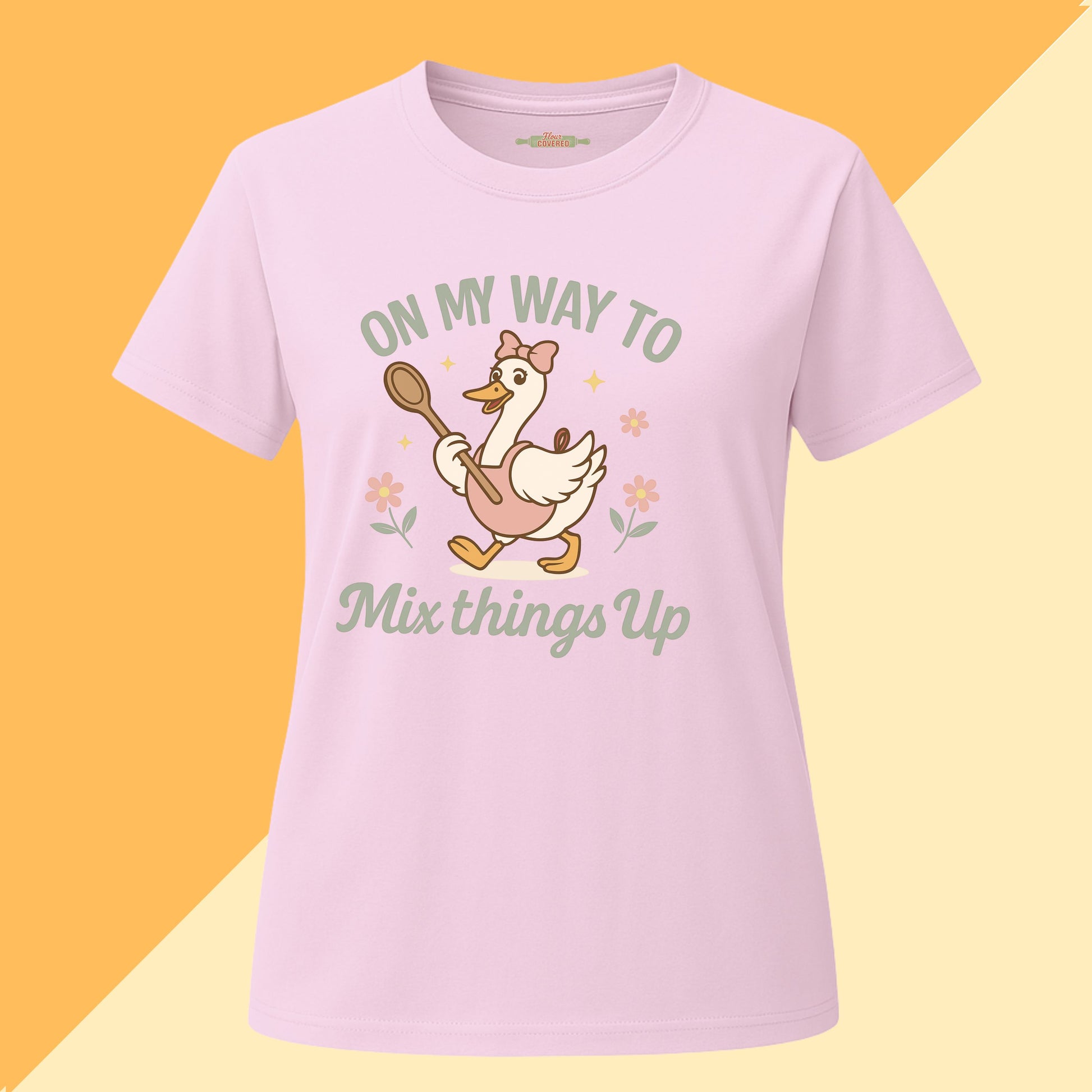 The On My Way to Mix Things Up Tee features an adorable duck on a baking mission. Spoon in wing and ready to stir up some fun.